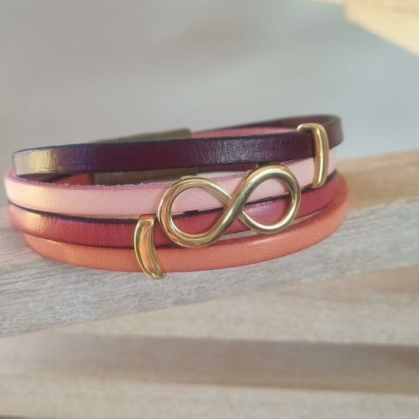 Bracelet femme composé de cuirs de différentes teintes : un doux cuir rose, un rose plus foncé, un bordeaux profond et un corail vibrant cuir plat bordeaux 5mm