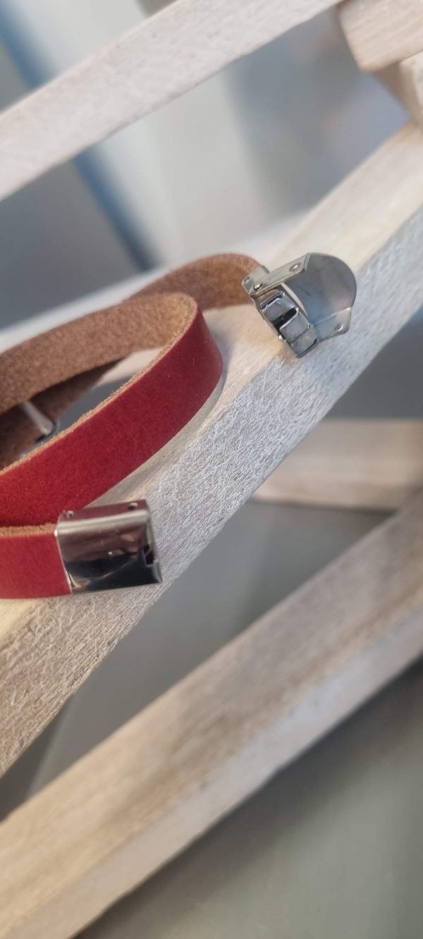 Bracelet femme double tour en cuir plat 10 mm rouge cranberry agrémenté de deux passants ‘flèche » en zamak argenté