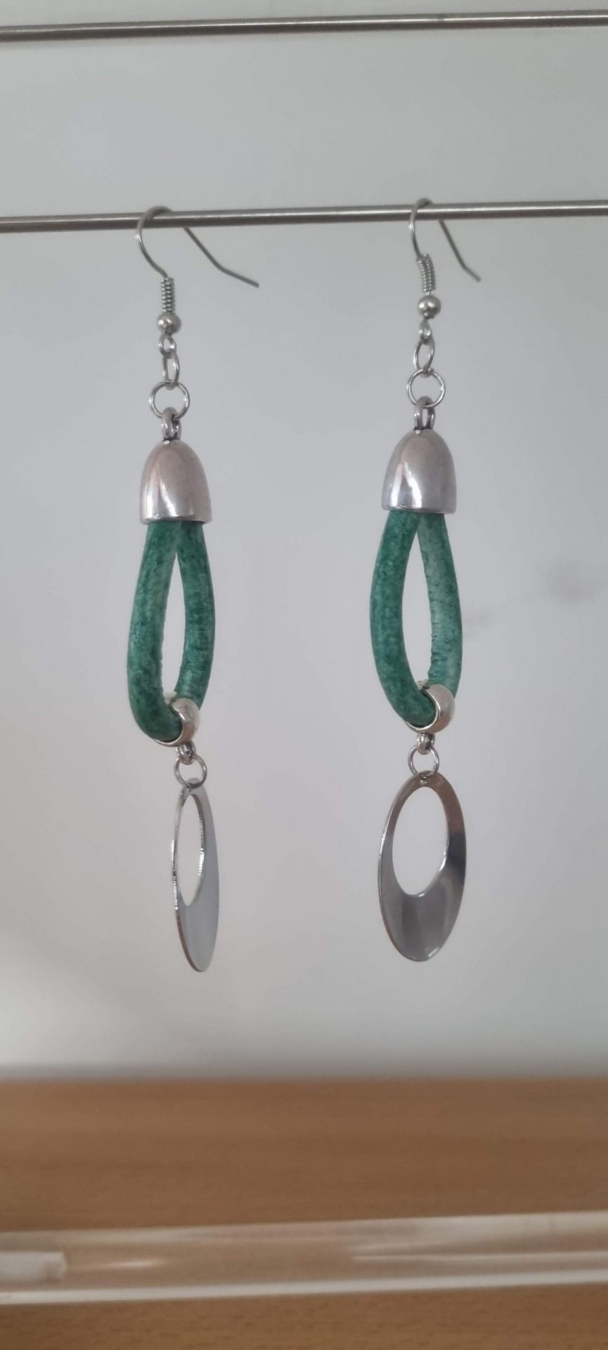 Boucles d’oreille en cuir rond vert vintage agrémenté d’une bélière boule et d’un pendentif ovale rhodium
