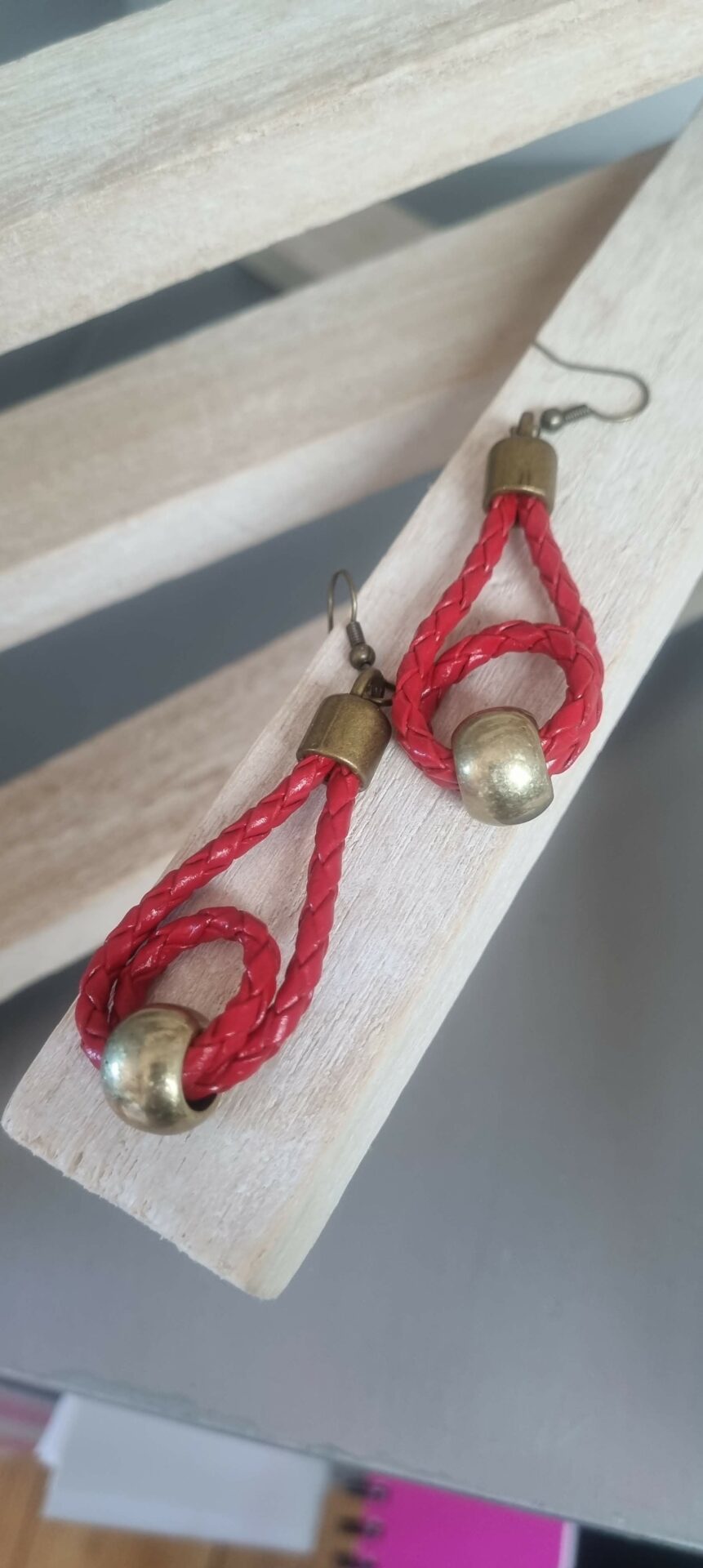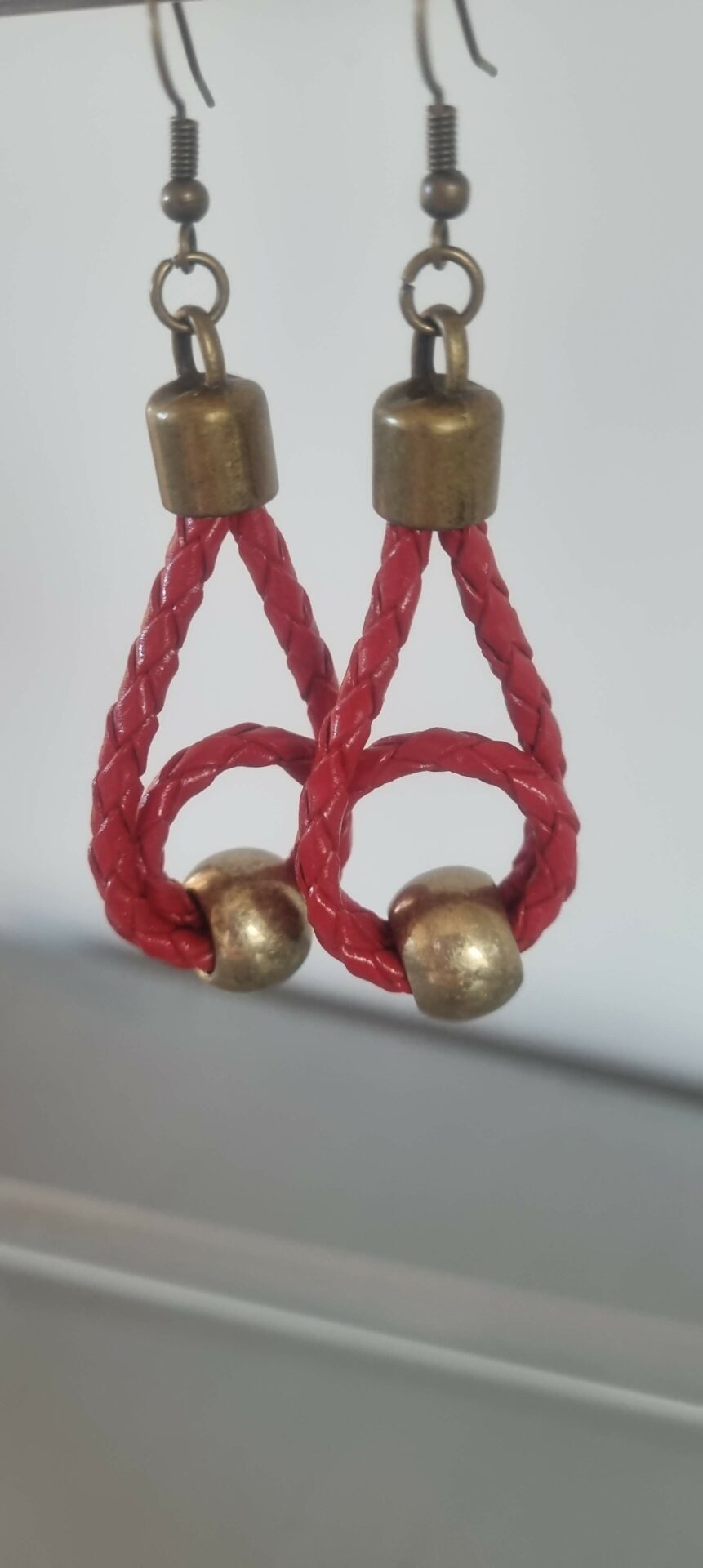 Boucles d’oreilles femme en cuir rond tressé 3 mm rouge enroulé dans une perle acrylique vieil or