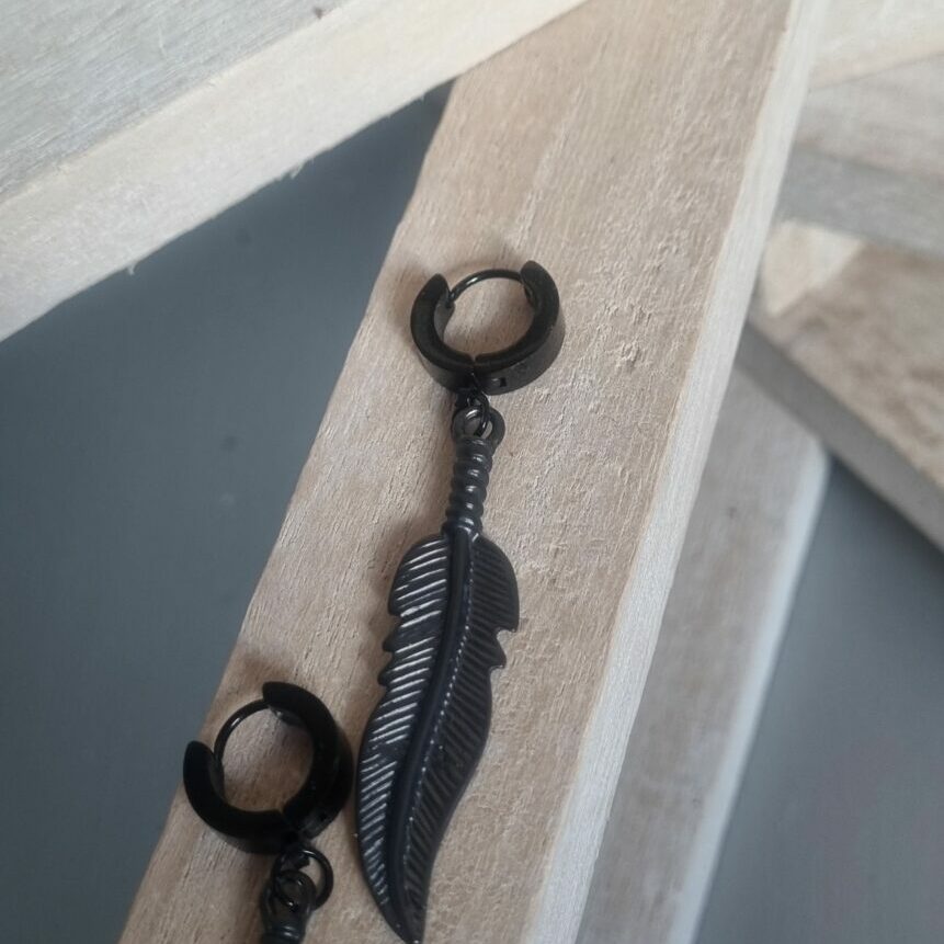Boucles d’oreille mixte composées d’un pendentif plume noire en hématite mat
