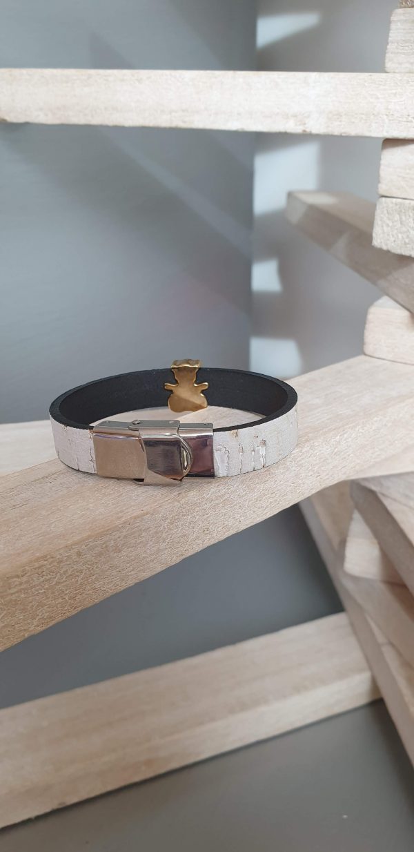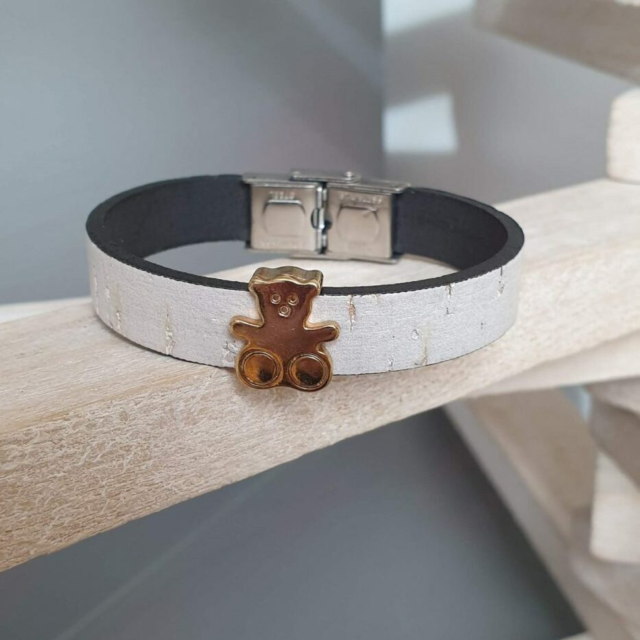 Bracelet enfant composé d’un cuir plat en liège blanc 10mm agrémenté d’un ours en zamak doré clair