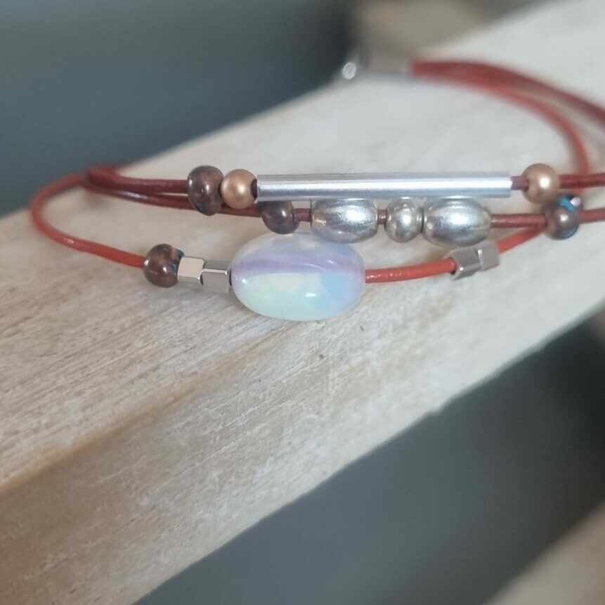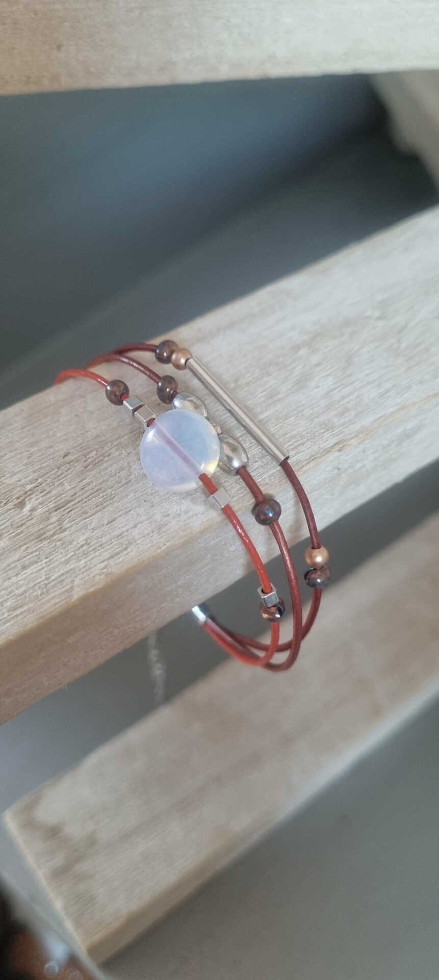 Bracelet femme, ado composé de trois cuirs ronds 1mm (rouge vintage, marron roux métallisé et orange) agrémentés