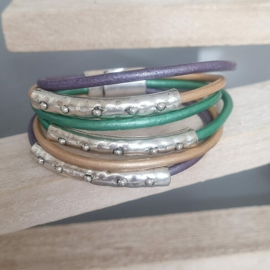 Bracelet femme constitué de six cuirs ronds 3mm (vert, doré et violet métallisé) agrémenté de trois tubes courbes argentés vieillis.