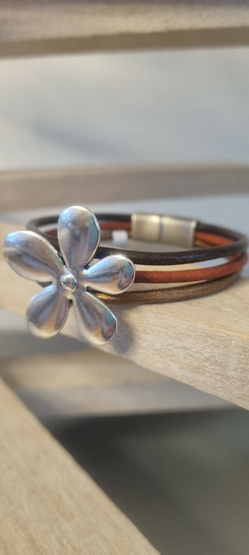 La grande perle marguerite à trois trous est le point focal du bracelet, apportant une note florale et délicate qui complète parfaitement les teintes chaudes des cuirs. Son design unique et artistique fait de ce bracelet un accessoire qui se démarque tout en restant élégant.