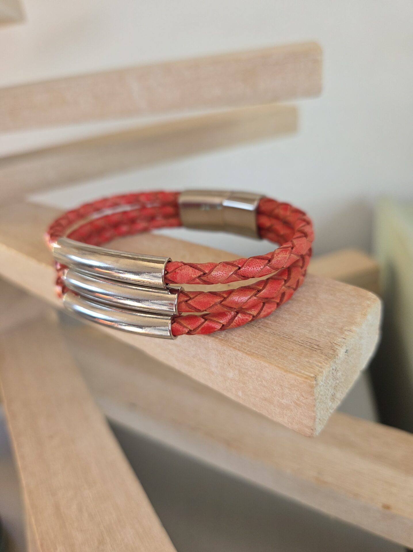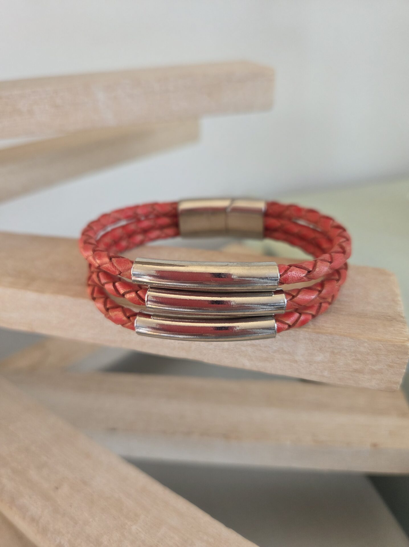 Bracelet femme en cuir rond tressé 4mm rouge vintage et ses trois tubes rhodium