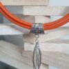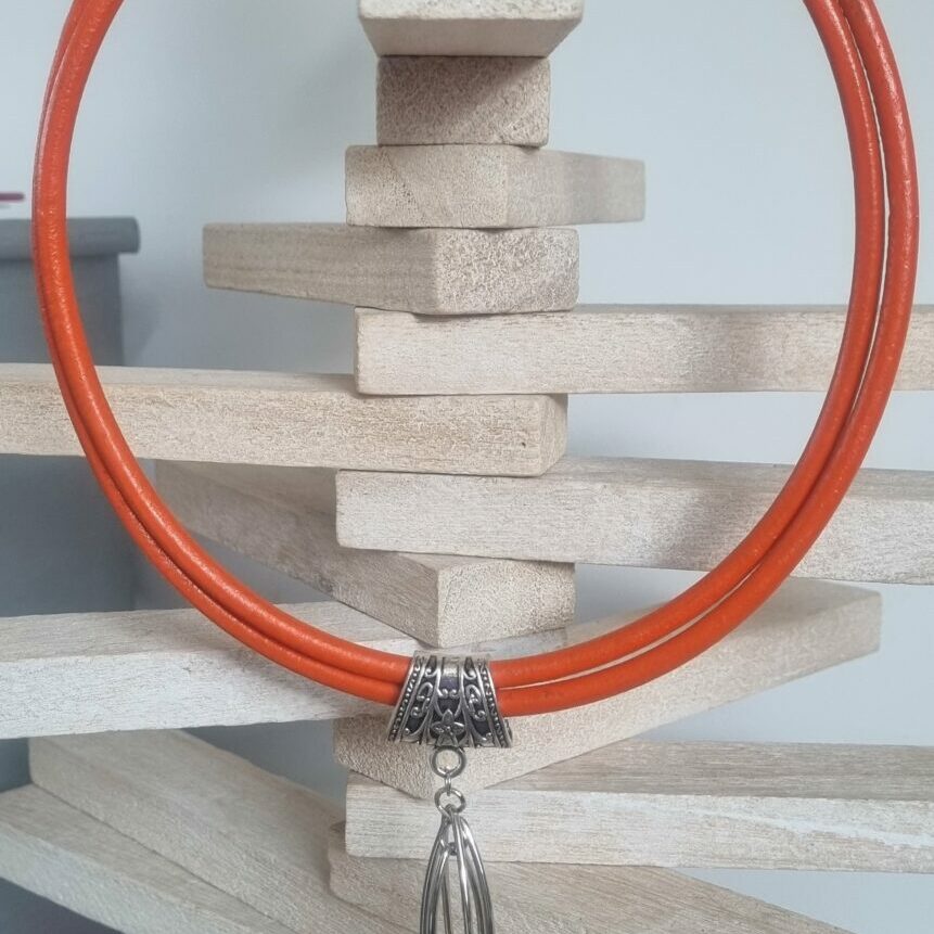 Collier femme composé de deux cuirs rond 4.5mm agrémenté d’un pendentif trois ellipses rhodium monté sur une bélière motif fleur