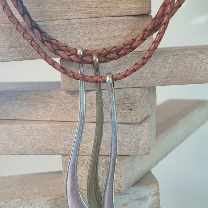 Chaque rang est réalisé en cuir rond de 3 mm, offrant à la fois souplesse et robustesse. Ce collier est orné de trois pendentifs distincts, deux en vieil argent et un en vieil or, mesurant chacun 87 mm. Ces pendentifs apportent une touche d’éclat et de sophistication, créant un contraste saisissant avec les cuirs tressés.