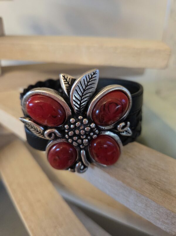 Manchette femme 25mm composée d’un cuir plat tressé noir et d’un cuir plat souple couture noir agrémentée d’un passant imposant en zamak argenté avec une fleur rouge